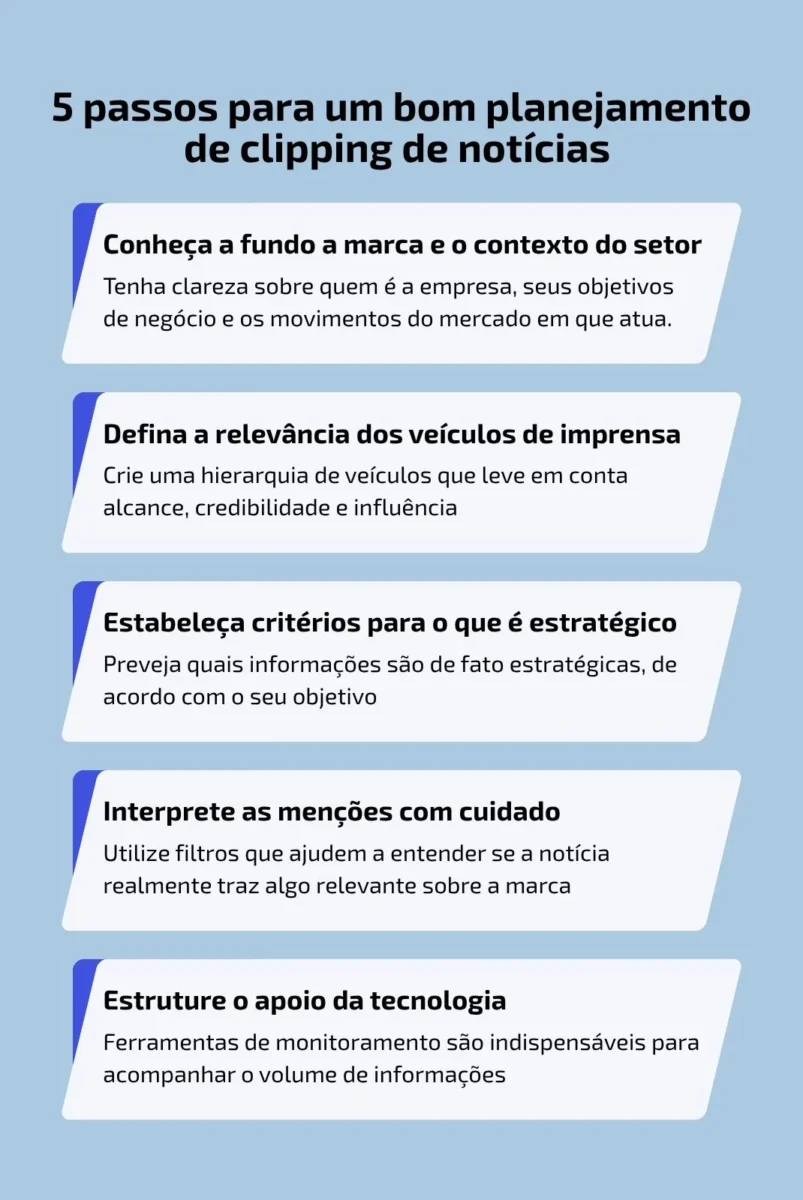 Notícia em excesso pode atrapalhar. Por isso, o planejamento deve prever quais informações são de fato estratégicas, seja para a reputação, para acompanhar concorrentes ou para mapear tendências do setor. Assim, evita-se o desperdício de tempo com publicações que pouco contribuem.