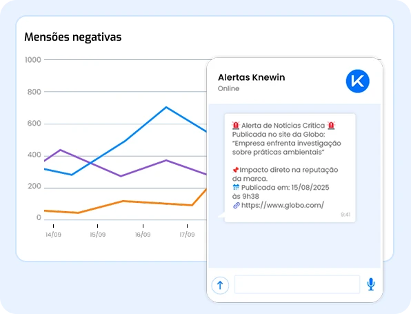 Receba alertas inteligentes em tempo real (inclusive no WhatsApp) sobre menções críticas e riscos emergentes a reputação da sua marca.