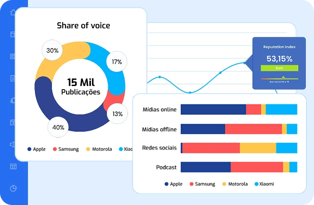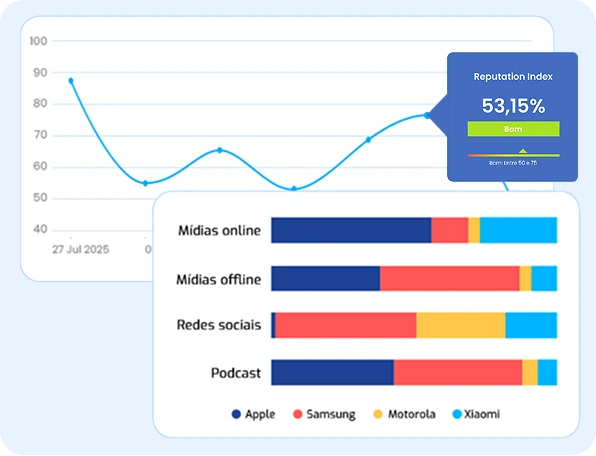 Com dashboards intuitivos e o Reputation Index, você acompanha a evolução da reputação e mede o impacto das suas ações de comunicação em mídias online e offline, redes sociais, relatórios financeiros e podcasts.