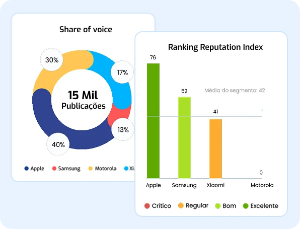Compare sua reputação com líderes do setor, acompanhe o share of voice e identifique os temas que fortalecem sua marca.